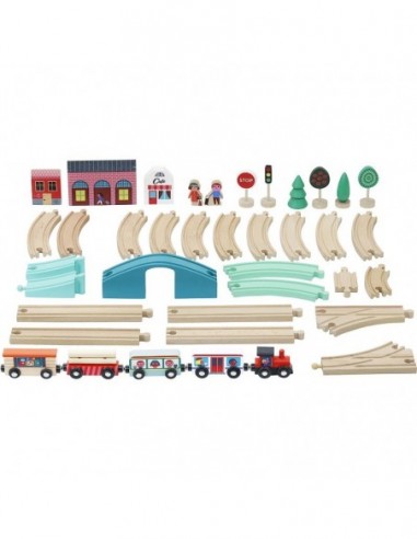 En voiture voyageurs, montez à bord du train Grand Express d'Ingela P.Arrhenius. Un joli circuit de train de 40 pièces en bois composé de : 1 locomotive, 4 wagons, circuit 24 pièces, 1 gare, 2 maisons, 2 personnages, 4 arbres et 2 panneaux de signalisation. Compatible avec de nombreux autres circuits de train disponibles sur le marché. Livré dans sa valisette de voyage en carton
