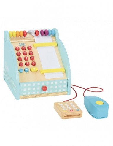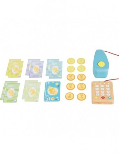 Une caisse enregistreuse en bois avec un tiroir caisse et une douchette sonore, des pièces et billets et une carte de crédit pour faire comme au supermarché pendant des heures et des heures.