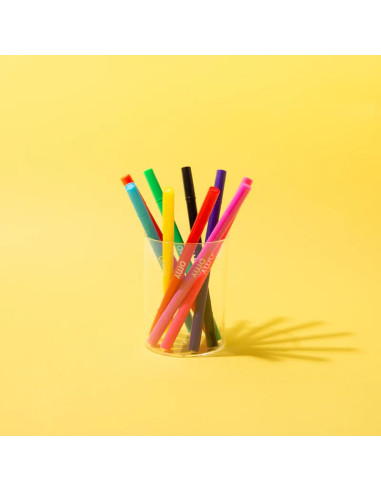 Boîte de 14 feutres magiques aux couleurs éclatantes et fluos. Complément indispensable des coloriages OMY, ces feutres double-pointe (fine et large) s’effacent ou changent de couleur grâce aux 2 effaceurs inclus. Pratique, la boîte se transforme en pot à crayons à la maison!