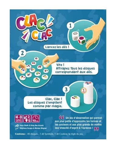 Tout le monde joue en même temps, règle simple, réflexe et observation Nombre minimum de joueurs : 2Nombre maximum de joueurs : 6Durée minimum de jeu : 10Âge minimum : 4Âge maximum : 8