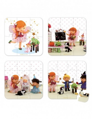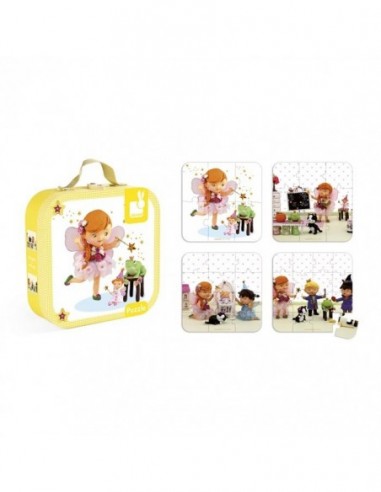 4 puzzles en carton (6-9-12-16 pièces) vendus dans une valisette carrée, facile à transporter grâce à sa poignée en tissu. Produit développé en collaboration avec les éditions Fleurus. Puzzles 20 x 20 cm.