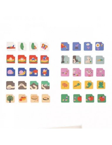 Jeu éducatif magnétique en carton sur le thème des véhicules. Composé de 50 magnets et de 18 cartes. Une fois le livre ouvert, le but du jeu est de recomposer sur la scène le véhicule indiqué sur la carte à l'aide des magnets.
