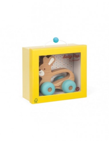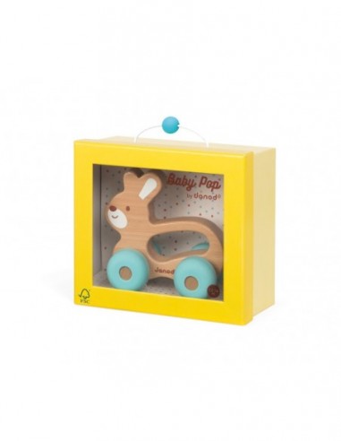 Le lapin à promener Baby Pop est un magnifique jouet d’éveil qui aidera votre enfant à développer sa motricité et son imagination grâce à sa prise en main facile. Ses couleurs lumineuses et son mélange de matières alliant douceur du silicone et noblesse du bois éveilleront et stimuleront votre bébé. Jouet à promener en hêtre (pour le corps) et silicone pour les roues. Axe des roues en métal. Certifié FSC. Peinture à l'eau. Boîte fenêtre avec couvercle PET et fond de boîte cadeau, cale imprimée pour maintenir le jouet en place à l'aide de liens transparents. Poignée de la boîte en nylon avec bille en silicone attachée à la poignée.