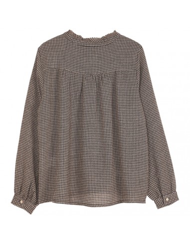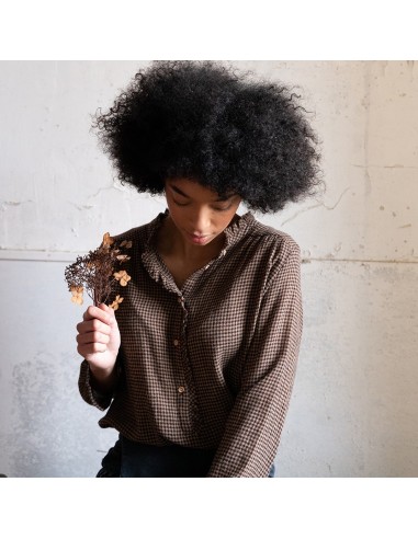 Blouse en mélange de laine et viscose vichy noir et marron. On aime le mélange, viscose et laine, chaud et fluide, les petits carreaux du vichy, les finitions de la patte de boutonnage et du pied de col froufroutées, terminées par un point picot. Cette finition est faite comme une broderie, en formant de tous petits noeuds qui séparent les fils du tissu. C’est un travail minutieux, qui pourra donc parfois présenter quelques légères irrégularités.