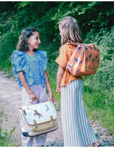 Cette charmante petite maison forestière est habitée par une joyeuse bande. Si votre enfant y glisse sa photo dans la pochette prévue à cet effet, il fera aussi partie de ses habitants. Ce cartable ergonomique est parfaitement pensé pour les petits, avec de magnifiques illustrations qui titillent leur imagination. Fabriqué en matériau PET recyclé.