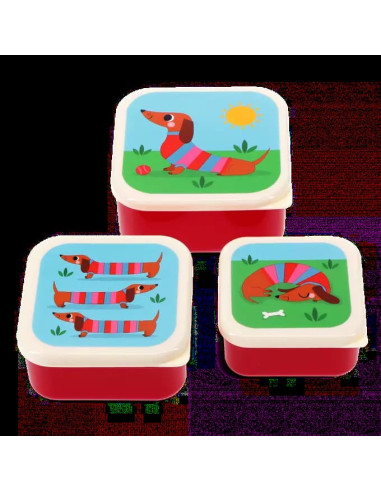 Un ensemble de trois boîtes à collations, avec différents imprimés de notre adorable chien saucisse sur les couvercles. Idéal pour ranger une gamme de collations dans des boîtes à lunch et les emporter lors de sorties.