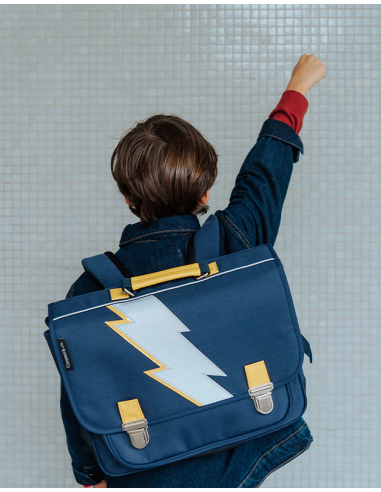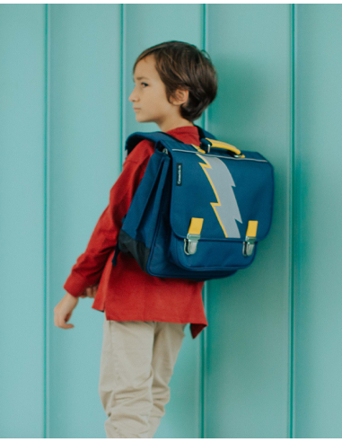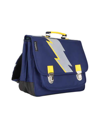 Cartable 38 cm, idéal pour les premières années de primaire des petits garçons, d'une stature entre 1,10 m et 1,30 m. Cartable au décor original et réfléchissant d'éclair métallisé pour les garçons aventureux !