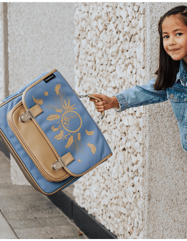 Ce cartable aux décors dorés sur fond lavande, pensé pour les filles rêveuses est composé d’une doublure intérieure en polyester 100% recyclé.