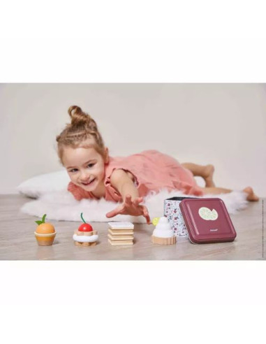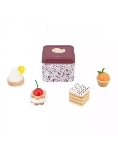 Janod s'occupe du dessert ! Laissez-vous tenter par l'une des 4 pâtisseries présentes dans ce coffret en métal. Destiné aux enfants à partir de 3 ans, ce set d'accessoires en bois invite à la gourmandise ! Vous avez le choix entre : 1 tarte citron meringuée, 1 millefeuille, 1 religieuse au chocolat ou 1 gâteau à l'abricot. Le tout présenté dans une jolie boîte à gâteaux. Voilà des délices réalistes qui complètent à merveille la dinette ou la petite cuisine des enfants ! En bois, avec parfois de la douce feutrine, mais toujours avec gourmandise ; ce set d'imitation invite au partage en toute occasion ! A l'heure du thé, pour le goûter ...