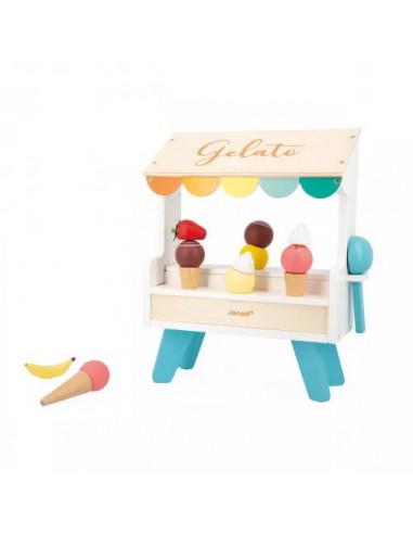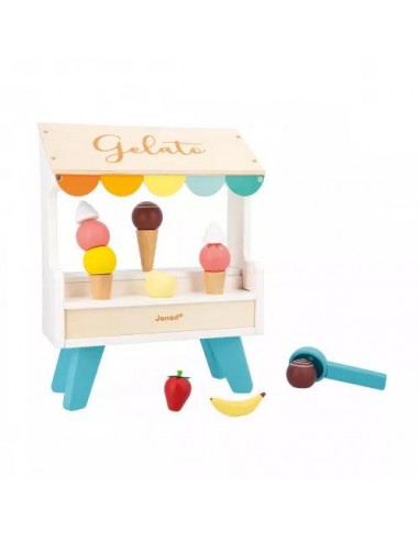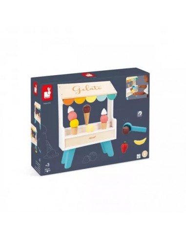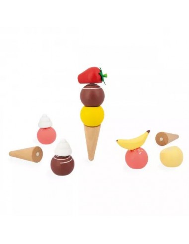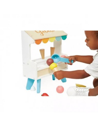 Plutôt glace à la vanille ou cornet à la fraise ? Goutez tous les parfums avec ce stand de glaces en bois ! Idéal pour les enfants dès 3 ans, ce jouet d'imitation rafraichissant promet de beaux moments de partage autour de délicieux cornets glacés. Il y a tout le nécessaire pour satisfaire les gourmands : 3 cônes, 6 boules de couleurs différentes, ainsi que des fruits et de la crème chantilly pour toujours plus de fantaisie ! Au total, 14 accessoires aimantés sont inclus : pratique pour ne pas faire tomber le contenu de son cornet. Toujours plus malin, la cuillère fournie est également magnétique et permet à nos petits vendeurs d'attraper facilement les boules de glace ! Une fois le client satisfait, on suspend la cuillère sur le côté de la marchande.