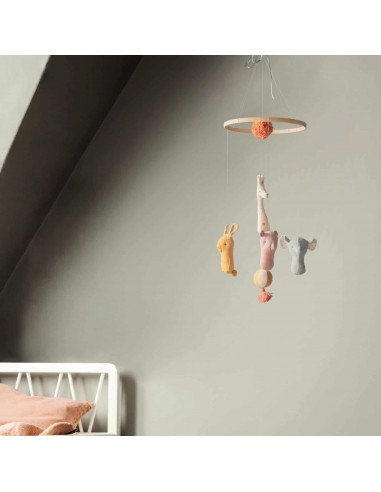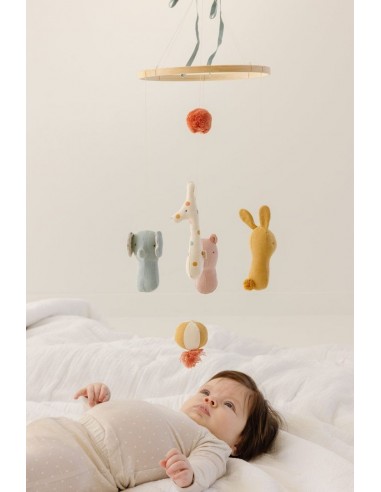 Lullaby friends est une collection de beaux articles pour bébés. Ce mobile est parfait pour que le bébé puisse le regarder depuis le lit ou la table de la crèche. Les animaux sont fabriqués dans des tissus doux avec des imprimés uniques et sont livrés dans une belle boîte cadeau.