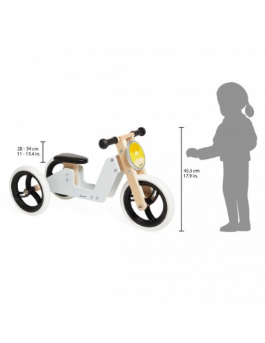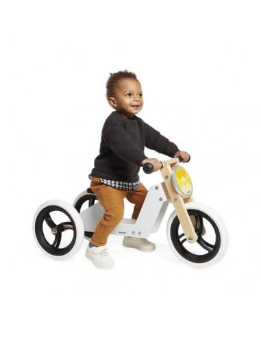 Poussez-vous, j'arrive ! Votre enfant pourra partir à l'aventure à bord de ce superbe bolide évolutif. Dès 18 mois, il pourra découvrir les joies de la route en position tricycle, ce qui lui permettra de trouver son équilibre, de travailler sa motricité et de suivre les grands à deux roues sans frustration. Dès qu'il aura pris de l'assurance, vers 3 ans en général, le tricycle se transformera en draisienne ! Une simple modification permet de changer les roues arrières pour n'en garder qu'une.