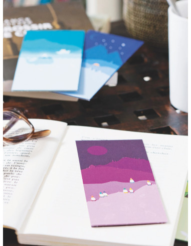 Réalisable dès 7 ans, cette activité manuelle ne comporte aucune difficulté. Les éléments en papier sont déjà prédécoupés. Chaque marque-page permet de composer un univers différent et de raconter sa propre histoire. Mélangez les paysages et les couleurs et fabriquez avec vos enfants une création originale. Votre enfant se lasse vite ? Pas de problème, la création ne prendra que 20 minutes.