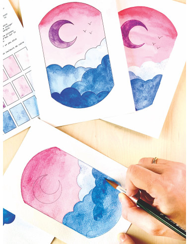 Tel un hublot ou une fenêtre ouverte sur une douce nuit, ce paysage au clair de lune, est une invitation à la rêverie. Avec ce kit Aquarelle Artisanale "Vue du ciel", réalisez votre première création et apprenez les techniques de superposition. Grâce à une méthode progressive, initiez-vous à l'aquarelle facilement ! Le kit vous permet de vous exercer avec un nuancier qui vous emmène à la découverte de l'intensité des couleurs et une fiche d'exercice. Celle-ci vous apprend une technique précise d'aquarelle : la superposition.