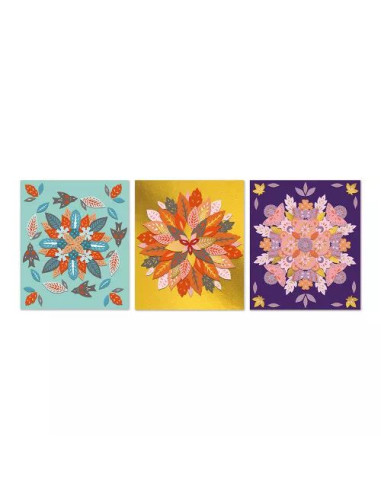 Ce coffret créatif mandalas contient : 3 tableaux et 6 planches de papier prédécoupé, dont 2 avec des effets de dorure. Un livret avec instructions et modèles à reproduire est aussi inclus, parfait pour que les petits artistes réalisent leurs mandalas en toute autonomie ! Voilà une activité manuelle sur le thème de l'automne qui stimulera la créativité, mais aussi la patience et la minutie des enfants. Il faudra compter environ 1h par tableau. Et une fois terminés, les mandalas peuvent être fièrement affichés pour décorer la chambre des fans de bricolages ou pour compléter votre décoration automnale partout dans la maison !