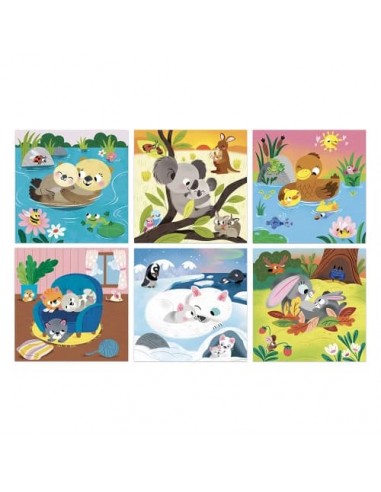 Ce coffret créatif contient 3 tableaux recto/verso de 20 x 20 cm et un pinceau à réservoir d'eau. Les illustrations mettent en scène des animaux câlins dans des décors pleins de tendresse : loutres qui se câlinent dans l’eau, une maman koala et son bébé perchés dans les arbres, des petits chats blottis sur un fauteuil, une maman serrant son petit dans ses bras et même des animaux polaires. Avec leurs bouilles attendrissantes, impossible de ne pas craquer ! C'est aussi l'occasion de décrire les différentes scènes et d'enrichir son vocabulaire. Regardez cette maman loutre qui flotte tranquillement, son petit bien installé sur son ventre : quel joli moment câlin au fil de l’eau ! En appliquant le feutre, les enfants découvrent des fleurs colorées, une grenouille curieuse et même une coccinelle. De quoi inventer plein d’histoires et stimuler son imagination ! L'atout principal de cette activité c'est qu'elle est sans fin : vous pouvez la recommencer à l'infini ! Ce kit permet de développer la motricité fine et la patience des petits. L'activité dure environ 20 minutes : plus qu'à attendre que ça sèche et c'est reparti pour un tour !