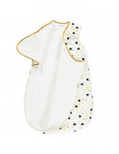 Une turbulette à la fois chic et pratique ! De jolis motifs géométriques noirs et jaunes moutarde dans un tissu en coton de qualité font de cette gigoteuse toute douce un beau cadeau de naissance. Le zip sur toute la longueur et le bouton pression permettent de bien envelopper bébé.