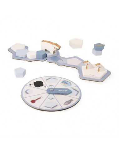 Chaque joueur fait tourner la roue : vous tombez sur l'iceberg ? On en place alors un devant l'ours qui peut avancer d'une case. Le poisson ? On récupère un poisson que l'ours pourra apporter à ses petits. Le thermomètre ? Mince, la glace fond : on enlève un iceberg et l'ours recule d'une case. La marée noire ? Pas de chance, on retire un iceberg et l'ours doit reculer d'une case. L'ours dans l'eau ? Dommage, c'est retour à la case départ ! Ce jeu ludique vous aidera à sensibiliser les enfants à la protection de l'environnement et vous promet de longs moments de jeux en famille ou entre copains ! Ce jeu de parcours contient : 1 pion ours, 2 pions oursons, 2 jetons poissons, 10 icebergs, 1 plateau en carton et 1 roue avec aiguille. Se joue de 2 à 6 joueurs. Ce jeu de société est composé de matériaux certifiés FSC® et de matériaux contrôlés.