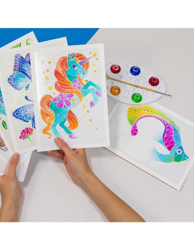 Le coffret créatif Aquarellum junior licornes de Sentosphère, une activité d'aquarelle à partir de 7 ans pour peindre en toute simplicté 4 magnifiques tableaux. Depuis 20 ans, quelques gouttes de peinture appliquées sur du papier serti séduisent les enfants. Cette technique leur permet de réaliser des tableaux d'un grand raffinement : le pinceau ne déborde pas, les motifs apparaissent comme par enchantement dès que l'on passe les encres, les couleurs surprennent par leur éclat. Aquarellum Junior est une gamme d'activité artistique idéale pour initier les enfants à l'art, stimuler leur imaginaire, leur concentration et leur habilité