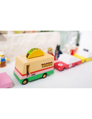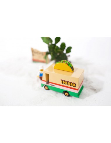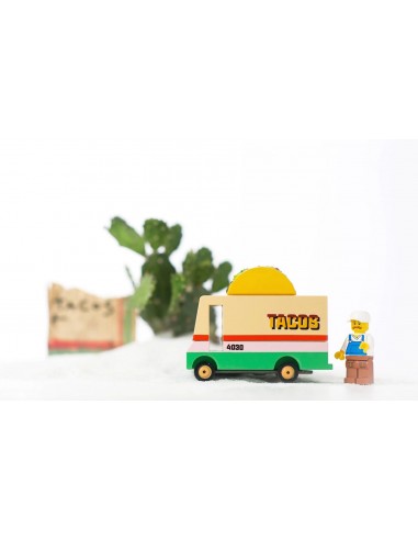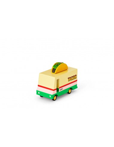 Notre Taco Van a été inspiré par les tout premiers FoodTrucks. Il a des couches de peinture amusantes et festives, des roues orange bien pétants et un super taco sur le toit.