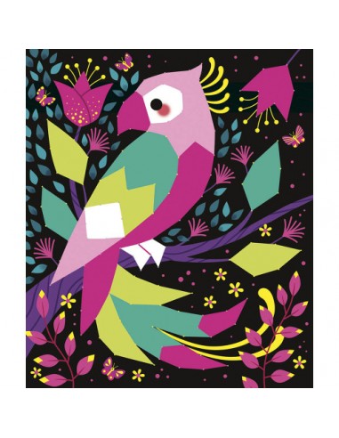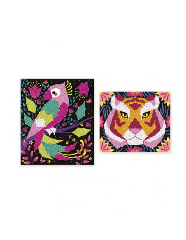 Avec un peu de patience et de concentration, 2 magnifiques têtes d'animaux verront le jour, un majestueux tigre et un flamboyant perroquet ! On place les clous de couleurs comme indiqué sur les tableaux en mousse puis on fait passer les bons fils (7 couleurs différentes) dans les zones dédiées. Les couleurs vives des impressions sont du plus bel effet ! Il faudra environ 3h pour réaliser chacun des deux tableaux.