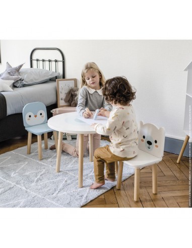 Rendez-vous sur la banquise ! Ce bel ensemble d'une table et 2 chaises en bois aux couleurs polaires feront fondre vos enfants. Ils passeront des heures à dessiner et jouer à leurs jeux préférés. Ils pourront même prendre le thé avec leur peluche adorées ou encore raconter toutes les histoires qui leur passent par la tête à leur frère et sœur. Cette table est facilement transportable et peut être installée facilement dans la chambre, la salle de jeux ou dans le salon pour être au plus près de papa et maman. Cet ensemble est adapté à la taille des enfants dès 3 ans. La table a un diamètre de 60 cm et mesure 47 cm de haut. Les chaises mesurent 49 cm de haut, la hauteur de l'assise est de 26 cm. Au centre de la table se trouve un pot crayon amovible pour pouvoir ranger les feutres et crayons de couleurs facilement.