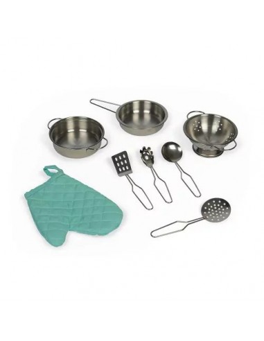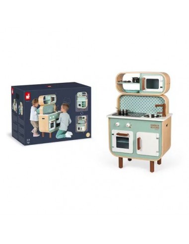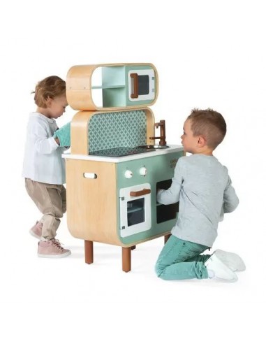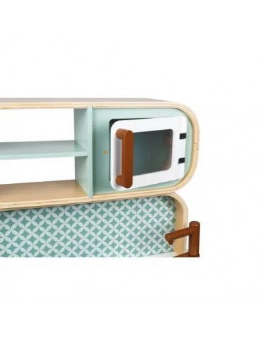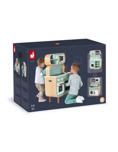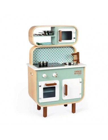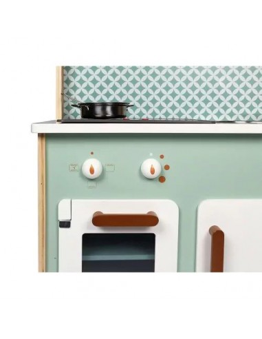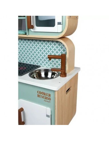Son côté recto-verso est un véritable atout ! Cette cuisine pour enfant permet d'offrir aux petits à partir de 3 ans un formidable terrain de jeu, seul ou à plusieurs en s'inventant des histoires côté cuisine comme côté lingerie ! Cette cuisinière Cooker Reverso a fait le plein d'équipements : un évier en métal et une plaque à induction sonore et lumineuse. Il suffit d'appuyer une fois sur les boutons rouges pour que les plaques s'allument, puis une deuxième fois pour entendre le son de l'eau qui bout. Le son et la lumière s’éteignent automatiquement au bout de 30 secondes ou lorsqu'on appuie une troisième fois. Pour l'aspect réaliste, on retrouve également 2 boutons rotatifs avec bruitage, un four, un micro-onde, un placard avec portes magnétiques. Pour compléter cette belle cuisine, 7 accessoires en métal sont inclus : 1 poêle, 1 casserole, 1 passoire, 1 cuillère, 1 spatule, 1 cuillère écumoire, 1 cuillère à pâtes et enfin 1 manique en tissu. Au verso, on découvre l'univers nettoyage du linge avec la machine à laver, les étagères de rangement, une horloge avec aiguilles à tourner et 2 boutons de programmation avec bruitages ! L’adorable style de cette cuisine jouet tout en rondeur, alliant à merveille le bois naturel, le vert d'eau et le blanc est mis en valeur par ces motifs géométriques vintage. Elle plaira tout autant aux petits qu'aux parents ! Grâce à ce beau jouet d'imitation au concept original, vos enfants ne manqueront de rien pour s'imaginer de longues et belles histoires ! Hauteur du plan de travail : 50 cm.