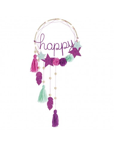 Comment ne pas être 'happy' en voyant cette magnifique suspension lumineuse à confectionner sur un cercle en bois ! Le rendu est superbe grâce à une vraie guirlande lumineuse, des pompons à réaliser soi-même et des feutrines à suspendre. Cette décoration murale très tendance, dans des tons roses/violets permet d'afficher un message positif, à offrir ou à garder pour embellir sa chambre.