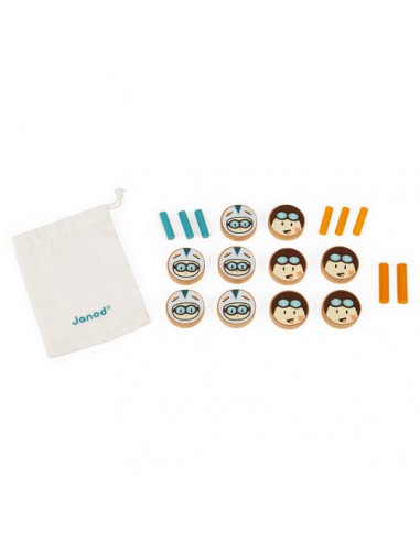 En plus d'être amusant, ce jeu est également très beau avec ce bois naturel et ces touches de couleurs vives. Les jetons sont des têtes de drôles de petits personnages équipés de casques pour ne pas risquer de se faire mal à chaque tour ! Ce beau jeu en bois est parfait pour les enfants à partir de 3 ans. Il développe la concentration et la vivacité… ainsi que le sens de la stratégie. Préparez-vous à des heures de jeu pour petits et grands. Un sac en coton permet de ranger tous les accessoires : 2 x 5 palets et 8 jetons pour marquer les points dans les emplacements prévus sur le jeu. Ce jeu est certifié FSC (bois issu de forêts gérées durablement).