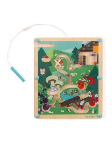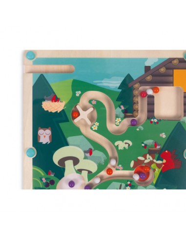 On exerce sa motricité fine grâce à ce joli jeu d'adresse pour les enfants à partir de 2 ans. Depuis le chalet, il faudra traverser le labyrinthe et apporter les 16 billes colorées dans la zone correspondante à l’aide du stylet magnétique ! Les billes rouges doivent se retrouver auprès des fraises des bois, les violettes à côté des mûres etc... Mais attention à bien prendre le tourniquet et à faire glisser la bûche magnétique pour ne pas être bloqué !