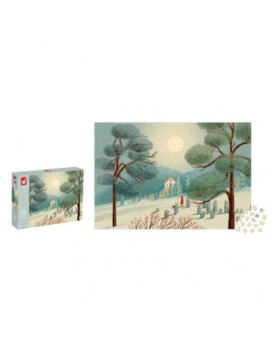 La saison froide nous offre dans ce magnifique puzzle de 1500 pièces un paysage délicat et poétique, qui donne envie de s'installer confortablement dans un bon fauteuil pour savourer chaque pièce de ce jeu de patience. Aiguisez votre concentration pour reconstituer, élément par élément, cette scène enneigée où la nature en sommeil accueille une promeneuse en rouge écarlate qui profite d'un environnement calme et reposant avec son chien.