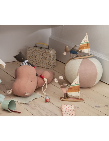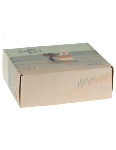 Temps de vacances. Cette souris est prête pour une journée à la plage. Il porte un maillot de bain et apporte sa planche de surf comme il préfère utiliser le temps sur la mer. La planche de surf et le mât sont en bois.