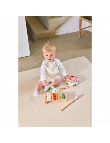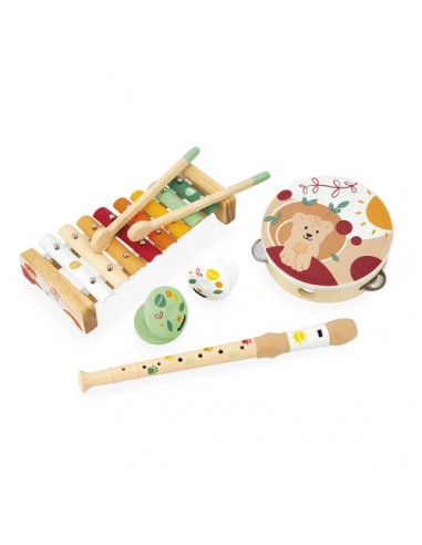 Il se compose de deux castagnettes, d'un tambourin avec cymbalettes, d'une flûte et d'un xylophone en métal avec 8 tonalités et ses deux baguettes en bois. Ce set de jouets musicaux complet permettra aux enfants de découvrir différents sons, ou à plusieurs enfants de jouer ensemble !