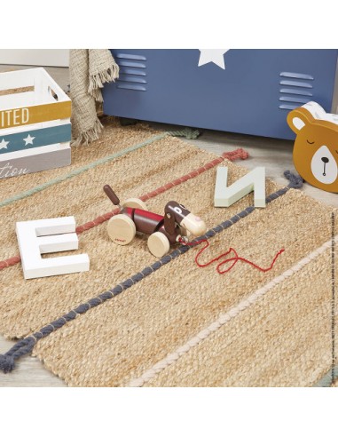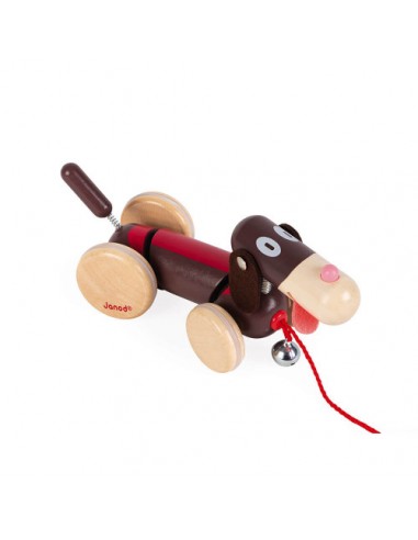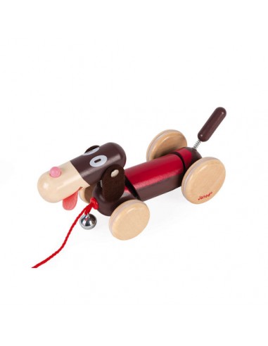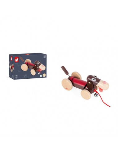 Son astuce pour faire rire les enfants ? Des parties de son corps sont montées sur ressorts et dandinent quand il bouge, une clochette tinte joyeusement, une langue en feutrine pend comme s'il avait déjà trop couru et ses roues arrière désaxées le font bouger de manière rigolote ! Cet animal à tirer est certifié FSC® (bois issu de forêts gérées durablement).