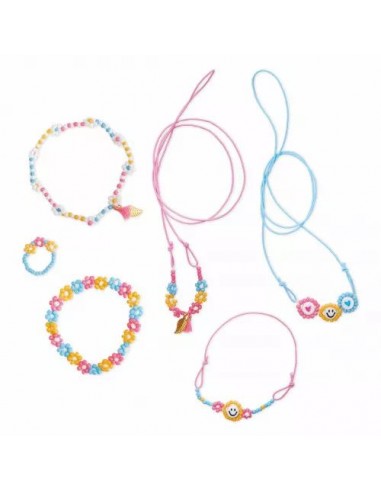 Des bijoux qui donnent le sourire ! Ce kit créatif propose aux enfants à partir de 6 ans de réaliser 6 bijoux fleurs à l'aide de perles : un atelier bijoux idéal pour stimuler la créativité et la minutie des petits. Le coffret contient : 1 fil ciré blanc, 2 cordons élastiques (bleu et rose), 1 fil nylon transparent, 2 perles "smiley", 2 perles cœur (rose, bleue), 4 tubes de perles de rocaille (blanches, roses, oranges, bleues), 2 petits pompons rose fluo et 2 breloques feuilles dorées. Un livret d'instructions est aussi fourni : il contient tous les modèles et instructions pour créer ses bijoux pas à pas. Le contenu de ce coffret créatif permet de réaliser 3 bracelets, 2 colliers et 1 bague.