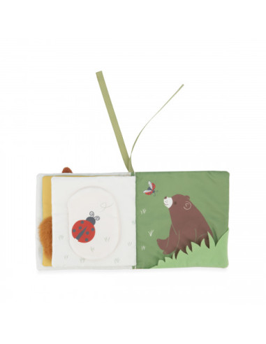 D’une grande douceur, il peut être utilisé pour caresser la peau de bébé et l’apaiser, tout comme pour mimer les aventures de Paprika et faire rire votre tout-petit aux éclats. L’autre atout de ce jouet d’éveil, ce sont les jolis rubans verts qui permettent de suspendre le livre en tissu partout, et ainsi laisser bébé en profiter en toute autonomie. Vous pouvez également les utiliser pour accrocher la petite peluche renard à l’imagier, et ainsi ne pas la perdre. Jouet d’activité idéal pour stimuler bébé, ce livre en tissu mesure 14 cm et est composé de popeline, fourrure synthétique, micro-velours, tricot et coton. Le petit doudou renard mesure 11 cm, il est en micro-velours et fourrure synthétique (polyester) et rembourré avec du polyester recyclé. Cadeau de naissance parfait, ce livre d’éveil pour bébé invite au partage, à l’exploration et à l’imagination. L’imagier et la peluche sont lavables en machine à 30°.