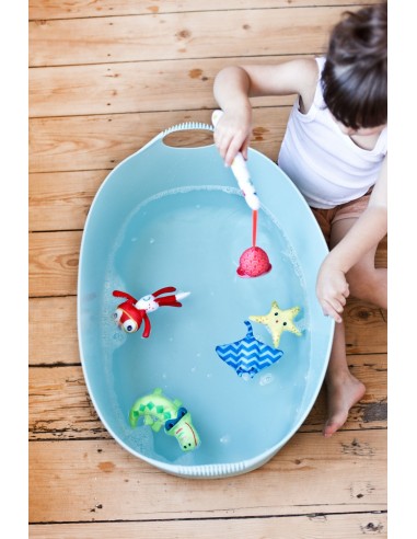 C'est l'heure du bain ! Partons à la pêche avec ce magnifique jeu alliant divertissement et concentration. Ce jeu de pêche tout mignon est composé d'une canne aimantée ainsi que cinq petits personnages souples à attraper : nous retrouvons Alice la renarde avec son masque de plongée, une étoile de mer, un poisson rouge, une raie et un crocodile. Votre enfant s'amusera à les récupérer dans l'eau à l'aide de sa canne à pêche munie d'un aimant. Grâce à cet adorable jeu d'éveil, le bain se transformera en un véritable moment de joie et de rigolade. Votre petit stimulera sa dextérité et développera ses capacités de concentration afin de ne pas repartir bredouille ! Idée cadeau originale pour un premier anniversaire.