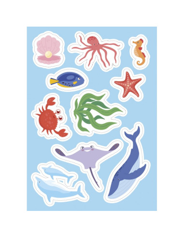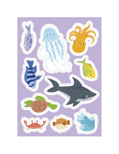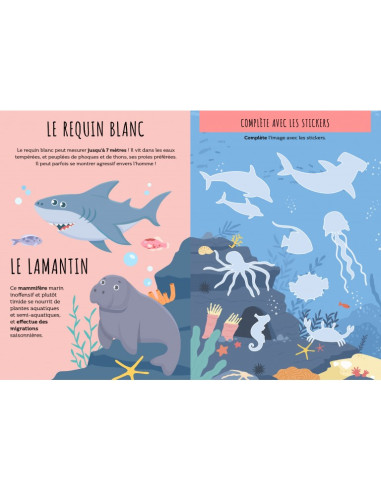 Un  livre d’activités pour les jeunes enfants avec des pages à colorier, des labyrinthes à résoudre, des autocollants à coller et de  nombreuses informations amusantes sur les créatures qui peuplent la mer.