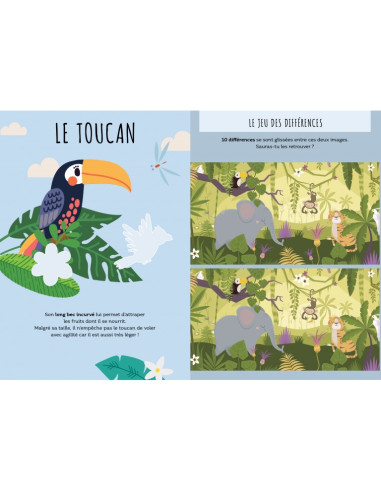 Un livre d’activités pour les jeunes enfants avec des pages à colorier,  des labyrinthes à résoudre, des autocollants à coller et de  nombreuses informations amusantes sur les créatures qui peuplent la jungle.