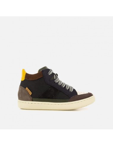 Play Nock est une chaussure pour enfant, présentée ici dans une version en toile nylon noir, avec des empiècements en cuir nubuck bleu marine et ocre. Cette chaussure est conçue avec des matériaux de qualité : légère et souple pour le bon déroulement du pied. Elle a une tige haute avec laçage pour un bon déroulement de la cheville et du cou-de-pied. Elle se chausse et se déchausse facilement grâce à ses bandes auto-agrippantes.