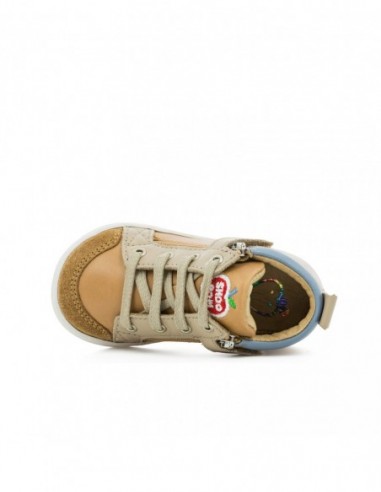Chaussure premiers-pas mi-montante à lacets et double zip intérieur/extérieur en cuir lisse camel, taupe et bleu. Doublure cuir sans chrome. Semelle intérieure amovible en cuir sans chrome. Bout-dur mi souple à l'avant pour la résistance, contrefort prolongé à l'arrière pour le maintien. Semelle souple en caoutchouc.