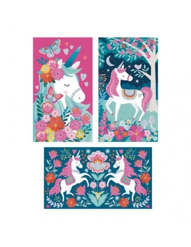 Attention, pluie de paillettes en vue ! Les enfants à partir de 6 ans vont pouvoir donner vie à de jolies licornes et à leur décor enchanté ! Ce kit créatif permet d'ajouter facilement des paillettes de 2 couleurs différentes à 3 tableaux.