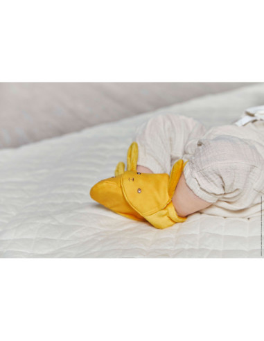 Les chaussons pour bébé, assortis au doudou et à l'anneau de dentition, conviennent aux enfants de 0 à 6 mois (ils mesurent 11 cm de long). Fabriqués en bi-matières, avec du velours côtelé et de la suédine, ils confortables et adorables aux pieds de bébé avec leurs petites oreilles de lapin ! Ils feront craquer toute la famille portés à l'occasion d'un shooting photo pour annoncer la naissance du tout-petit, par exemple.