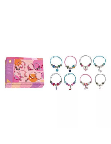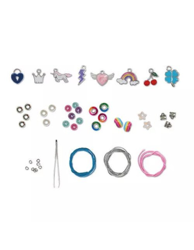 Au total, ce coffret de loisir créatif contient : 15 perles rondes argentées, 15 perles rondes craquelées, 8 perles intercalaires avec anneaux, 8 perles nacrées, 8 breloques (arc-en-ciel, cœur, trèfle, cœur ailé, cerises, couronne, licorne, éclair), 8 anneaux de raccord, 6 perles rondes dégradées, 2 perles étoiles, 2 perles arc-en-ciel, 1 pince, et des fils élastiques (bleu, rose, argenté). Grâce aux instructions et modèles fournis, les petits créateurs développent leur créativité et leur dextérité. Porter ensuite ces créations, ça donne la pêche pour toute la journée ! L'autre atout de ce coffret créatif, c'est sa boîte à conserver et à utiliser comme une boîte à bijoux ! Avec ses compartiments et ses jolis motifs, c'est le rangement idéal pour organiser avec soin ses bracelets préférés. Alors, mettez la chance (et la créativité) de votre côté avec ce kit de création de bracelets !