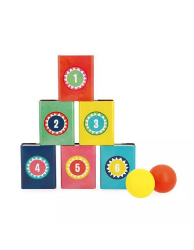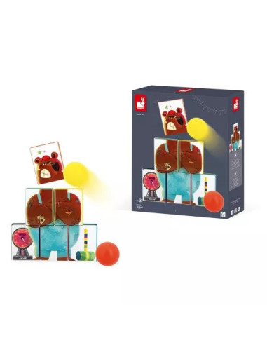 On dirait que cet ours veut conserver le meilleur score … Dès 3 ans, les enfants vont se hisser en haut du classement avec ce jeu de chamboule-tout ! Pour cela, il faudra faire preuve d'adresse et viser juste. Leur objectif : faire tomber un maximum de boîtes en un minimum de lancer ! Ce chamboule-tout se compose de 6 boîtes en métal rectangulaires et de 2 balles en mousse.