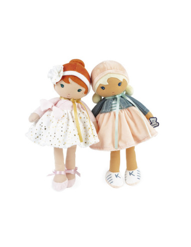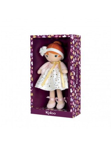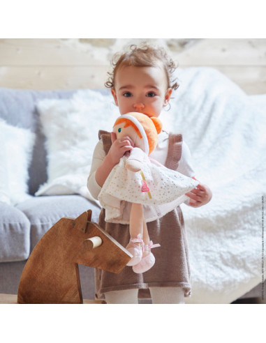 Découvrez la danseuse classique qui fera rêver toutes les petites fan de ballet ! Habillée d'un cache-coeur rose poudré réhaussé d'un foulard doré et d'une jupe toute douce à imprimé d'étoiles champagne, Valentine révèle un style délicat et raffiné. Sa chevelure rousse la différencie des autres poupées en tissu Tendresse de Kaloo.