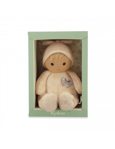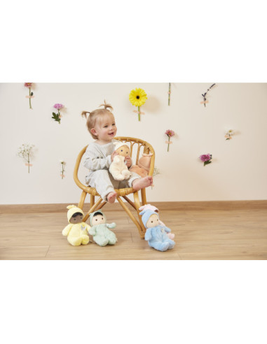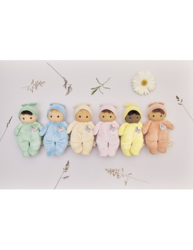Accueillez Bébé Jasmin, un merveilleux poupon en tissu, parfait comme doudou ou première poupée pour les tout-petits. Ce charmant poupon de 24 cm, avec ses yeux bleus captivants, est habillé dans une nuance crème élégante qui évoque la pureté et la tendresse. Le doux micro-velours et le velours côtelé, enrichis de polyester recyclé, offrent une texture moelleuse et réconfortante, parfaite pour les câlins. Son corps est orné d'un joli papillon, rappelant la légèreté et la délicatesse des fleurs, un détail enchanteur qui charmera à coup sûr. L'étiquette en forme de papillon est aussi une invitation à développer la dextérité et la curiosité sensorielle de bébé.