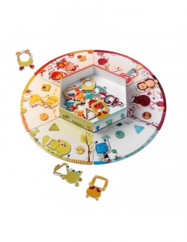 Seul ou avec tes copains, place les cartes au bon endroit autour de l’hexagone à l’aide des repères de couleur.  Pioche ensuite dans les pièces en carton et aide tes amis Lilliputiens à retrouver leur tête, à la manière d’un puzzle ! Observe bien les formes géométriques et les coloris pour faire les bonnes associations.