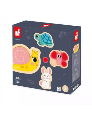 On retrouve les animaux favoris des tout-petits : un escargot de 2 pièces, une tortue de 3 pièces, un lapin de 4 pièces et un papillon de 5 pièces. Les pièces à replacer dans le bon ordre sur un support en bois sont suffisamment grosses pour que bébé puisse bien les prendre en main. L'assemblage de ce jeu d'éveil sera un vrai plaisir ! Avec ce jouet, vous pourrez également initier l’apprentissage des premiers chiffres. Puzzles en bois FSC®.