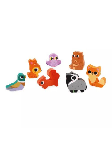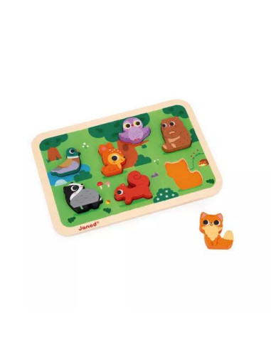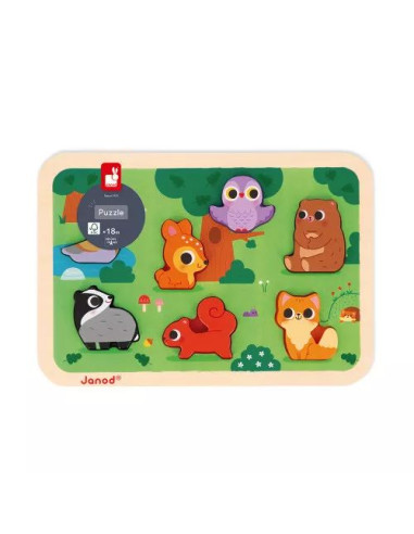 Toc, toc, toc, monsieur l'écureuil ? Découvrez notre puzzle en bois sur le thème de la forêt, conçu pour les bébés dès 18 mois. Ce jouet d'éveil se compose de 7 pièces épaisses, facilitant ainsi leur préhension par les petites mains. Chaque pièce du puzzle est spécialement conçue pour représenter un animal vivant dans la forêt : renard, écureuil, blaireau, faon, chouette, ours, canard. Et ce n’est pas tout ! Ces pièces peuvent également être utilisées comme figurines pour prolonger le jeu et stimuler l’imagination de votre enfant.